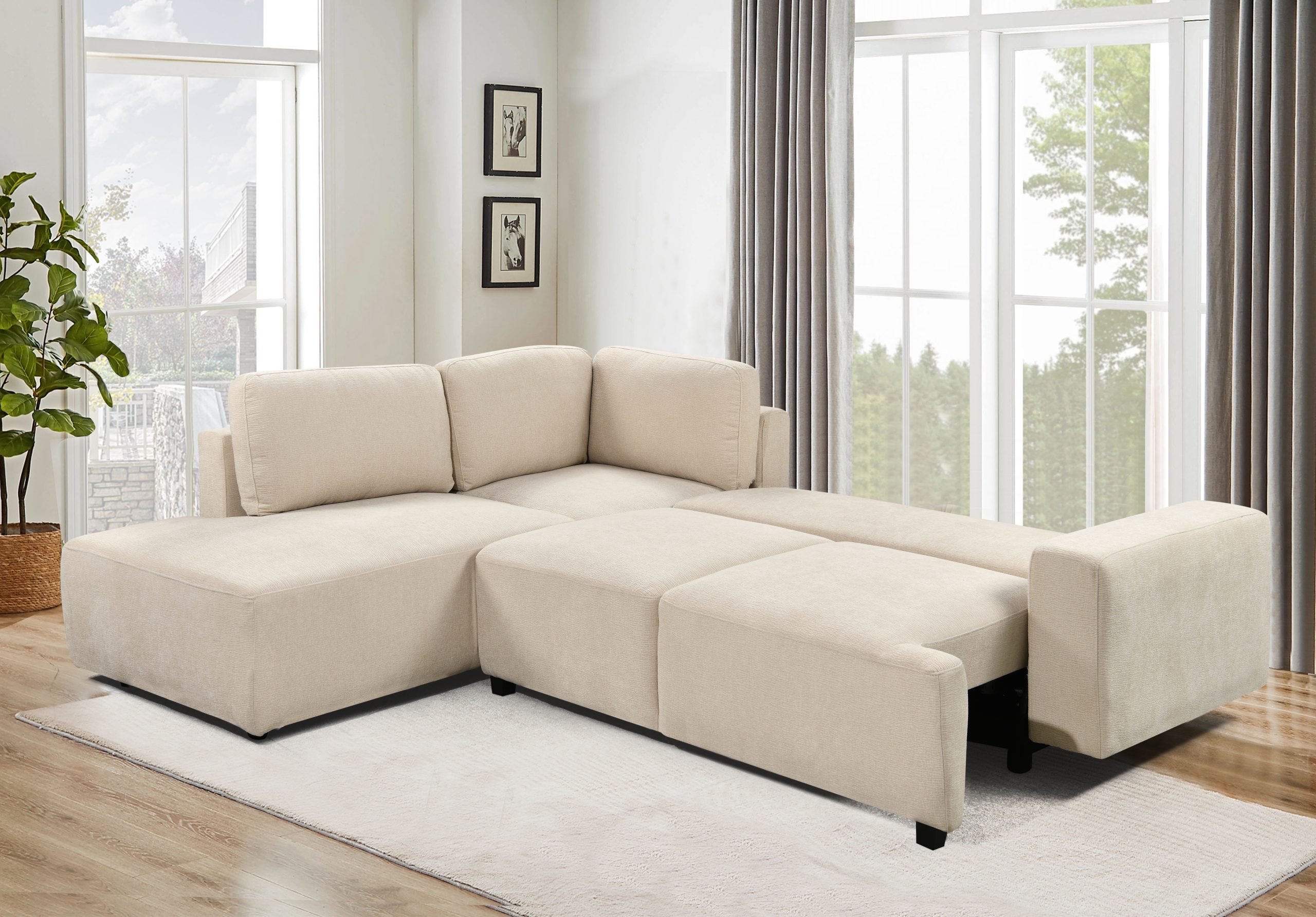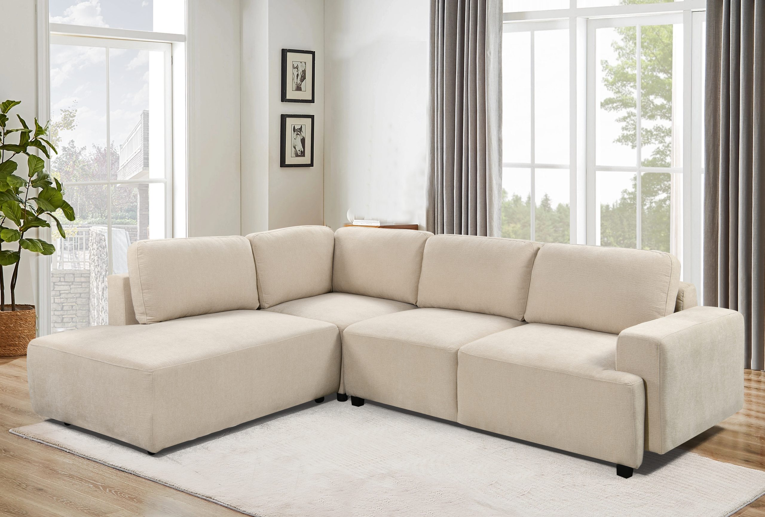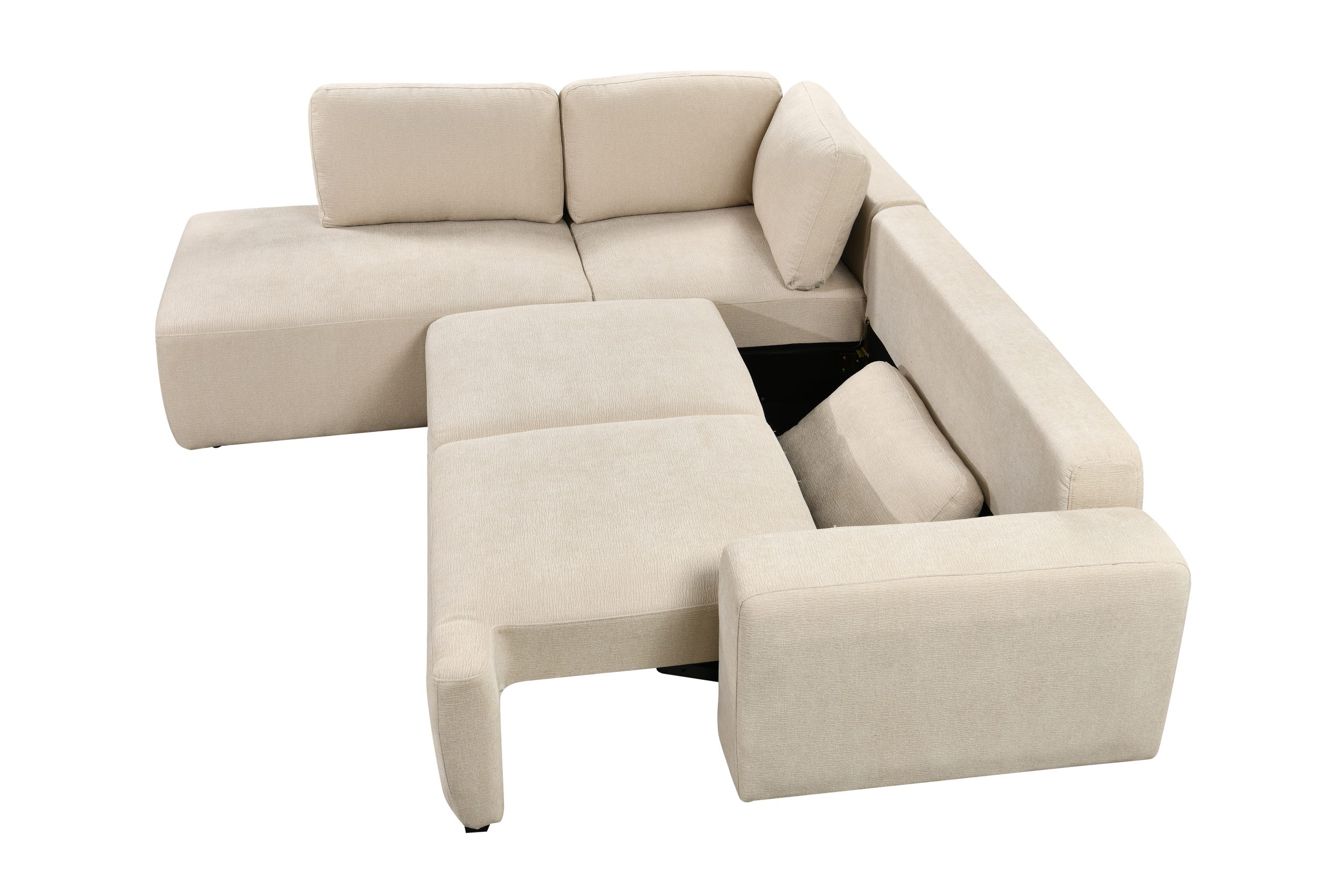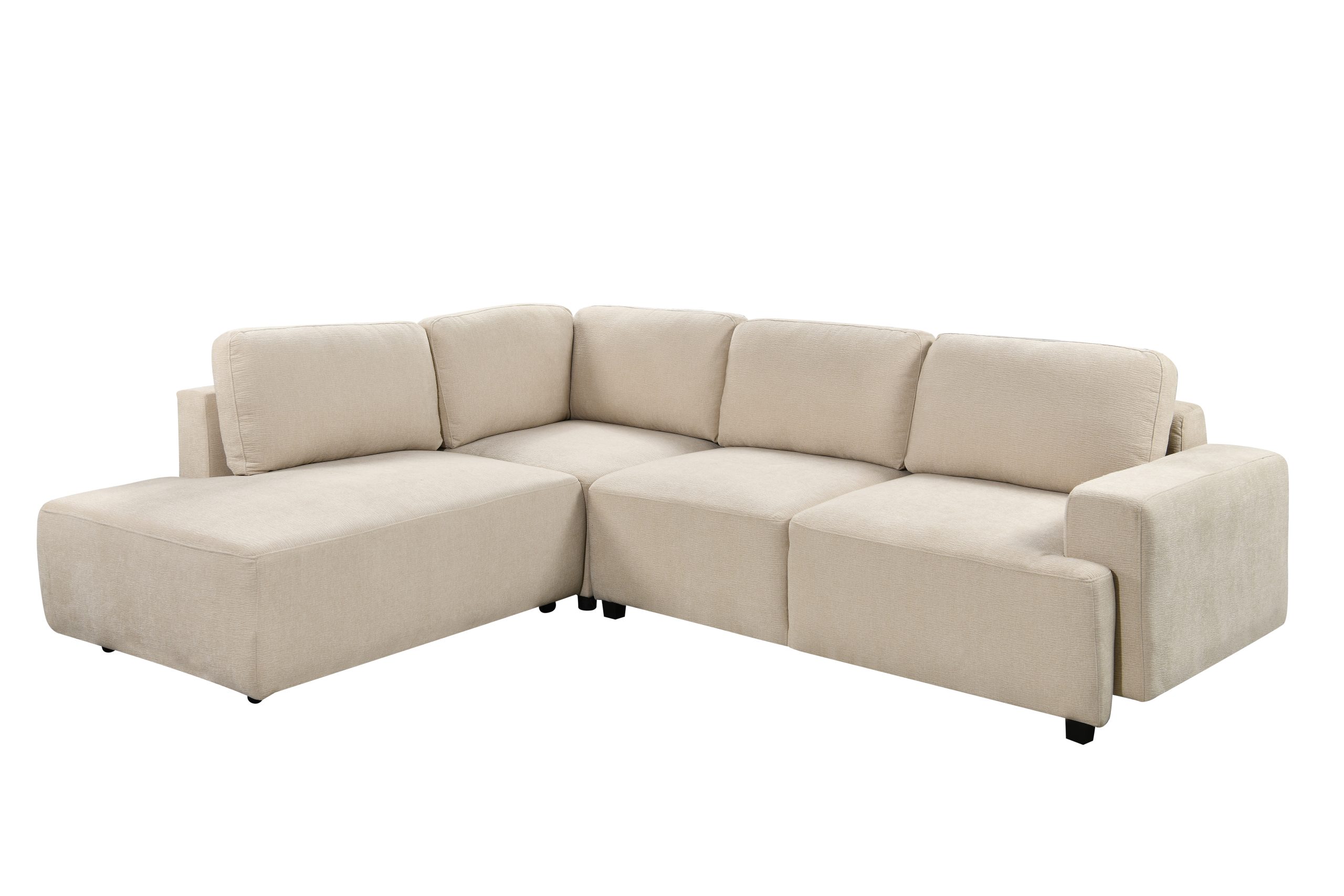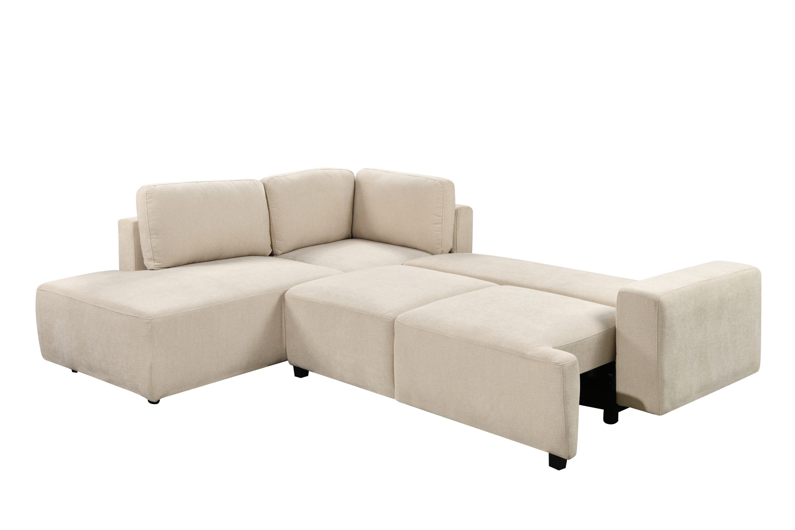 Este sofá esquinero versátil combina estilo y funcionalidad. Su estructura de madera maciza de eucalipto y contrachapado garantiza un soporte resistente. La chaise longue incorpora un práctico compartimento de almacenamiento para mantener tu espacio ordenado. Tapizado en tela suave con cojines rellenos de espuma para mayor confort, se completa con elegantes patas de plástico en acabado negro mate para un toque moderno.